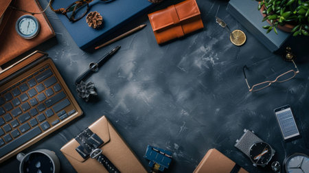 A flat lay of luxury office items, including a laptop, notebooks, watch, and glasses, on a dark textured surface, creating a sophisticated workspace aesthetic.