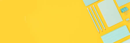 Banner with layout of mint color school equipment on a yellow background. Creative concept with copy space.