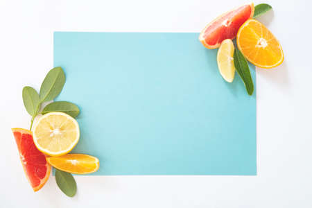 Overhead shot of minimal workplace and copy space with office supplies on white table background