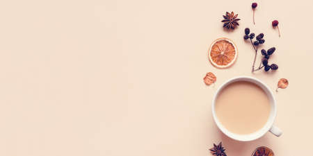 Autumn pastel background. A cup of hot coffee or tea with milk with autumn leaves and anise. Banner with copy space for text. Flat lay, top view.