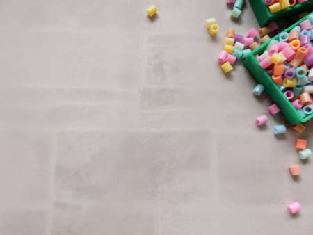 Colorful beaded jewelry with abstract shapes and glittery patterns on a textured background