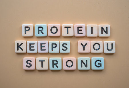 Colorful letter tiles arranged to convey a motivational message about protein and strength. Ideal for health, nutrition, and fitness themes.