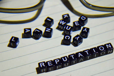 Concept of Reputation on wooden cubes with glass eye, books in Vintage background