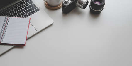 Top view of photographer workplace with laptop, cameras and office supplies on white table background with copy space