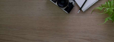 Top view of wooden workspace with camera, notebooks, pencil, decoration and copy space