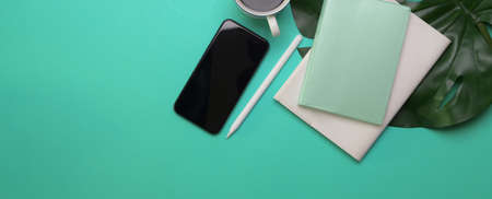 Top view of creative worktable with smartphone, diary notebooks, coffee cup, copy space and leaf decorated on table