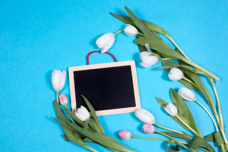 Mock up Greetings typing background. White blank condolence card with red tulip on the dark background. Fresh flowers. Empty place for a text. Womans valentines mothers day
