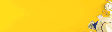 Banner travel and tourism office desk and workspace yellow background, straw hat and airline boarding pass, top view and copy space