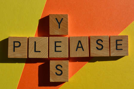Yes Please, words in wooden alphabet letters in crossword form isolated on yellow and orange coloured background