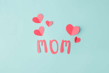Mothers day message on paper cut hearts over blue background, simple diy creative idea, banner, greeting card for mom
