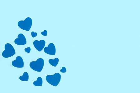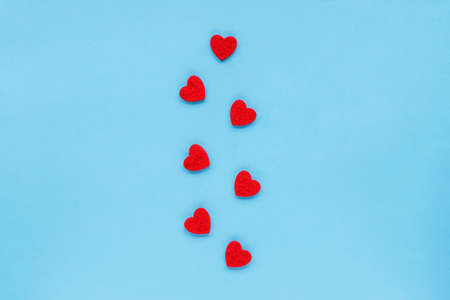 Ornament of red hearts on a blue background, top view, flat lay. Valentines day concept.