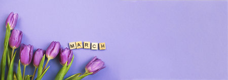 Purple bouquet of flowers tulips background with the word march on veri peri background. Flat lay, top view. banner
