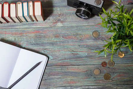 Office supplies in the wooden workspace. Top view with copy space for input the text. Designer workspace on desk table essential elements on flat lay