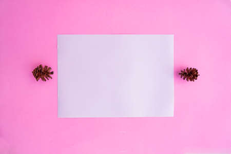 White Paper On Pastel Pink Paper Background With Spruce Flower Decoration. Business card. Business Card, White Paper. Paper Mockups