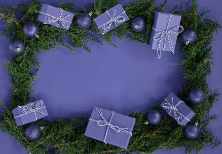 Flat lay new year Christmas boxes, balls, pine tree on very peri color of the year background. High quality photo