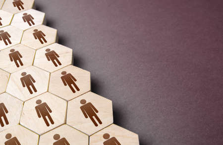 Hexagons with people in a structural order. Formation of company personnel, staffing. Hiring new employees and recruiting staff. Personnel management. Unity. Team discipline, teamwork cooperation.