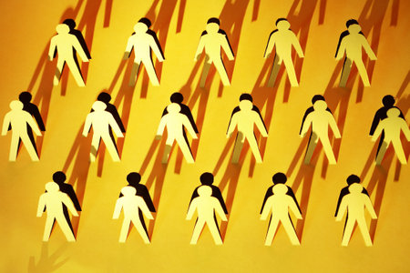 Origami people figures in a group standing closely together, A sea of paper people, united in their origami form but distinct in their designs