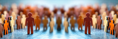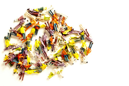 A group of small figurines in various sizes and colors representing diversity, unity, and multiracial cooperation. Concept of equality and teamwork.