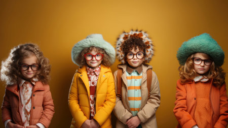 A group of stylish children wearing trendy glasses and winter clothing, posing with confidence against a vibrant yellow background. Perfect for concepts of friendship, fashion, and childhood.