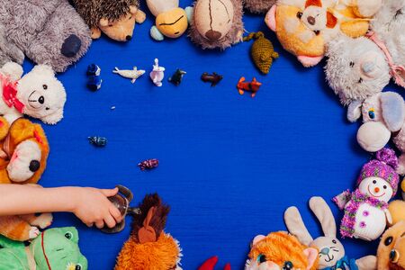 Funny kid lying in a very large quantity of toys. Childhood concept. Top view, flat lay.