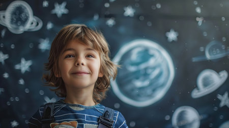 A young boy is smiling and wearing a blue shirt with a rocket on it.