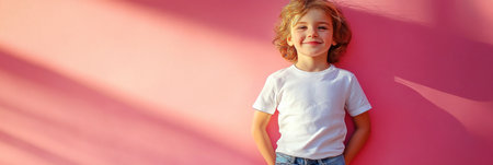 Adorable kid poses happily in a blank white t-shirt and trousers, surrounded by a pastel pink background, offering a stylish and fun mock-up template, banner