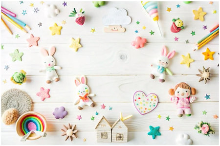 Colorful kids' toys, pastel background, stars and clouds, crafting