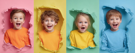 Happy children with colorful clothes peeking through torn paper in vibrant backgrounds expressing joy and excitement