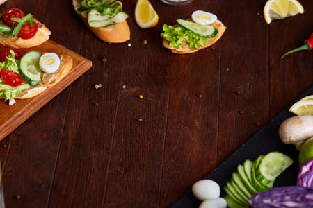 Breakfast still life with sandwiches, quail eggs, spicies and fresh fruits and vegetables, selective focus