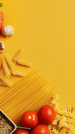 Cooking pasta, spaghetti tomato and garlic on a yellow background flat lay copy space