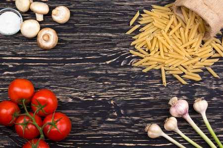 Pasta ingredients. Tomatoes, pasta, garlic, champignon and salt on wooden background