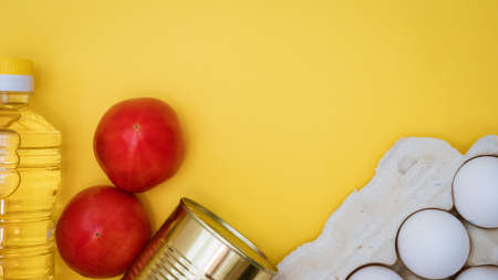 Food from the bottom on a wooden background. Food for donations. Top view, free space for text.