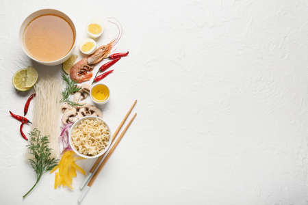 Italian food ingredients for cooking Spaghetti Pasta. Raw spaghetti pasta with various ingredient - onion, tomatoes, garlic, basil, parsley, cheese, olive oil. On white table background, flatlay copy space