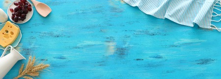 Top view photo of dairy products over blue wooden background. Symbols of Jewish holiday - Shavuot