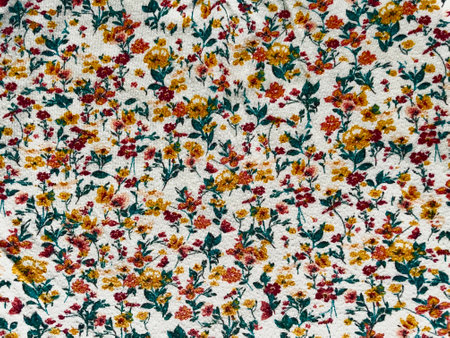 Fabric with a delicate floral pattern, close-up as texture. Old-fashioned cotton or linen textile in a retro style with a print of scattered colorful flowers.