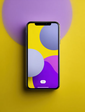 Smartphone displays a lively abstract wallpaper with circles in shades of purple and blue against a sunny yellow backdrop, creating a cheerful aesthetic.