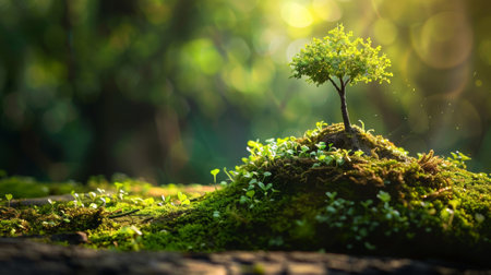 A tiny bonsai tree growing on mossy ground, illuminated by soft sunlight, creating a serene and enchanting nature scene.