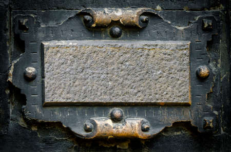 old vintage nameplate on rusty iron background, scratched and weathered, blank space for text