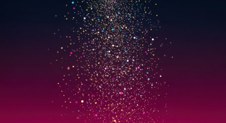 Colorful confetti particles floating in a dark background with shiny gold accents