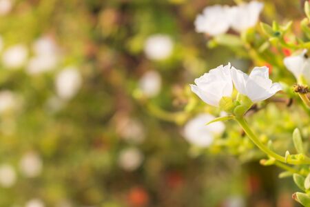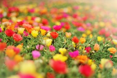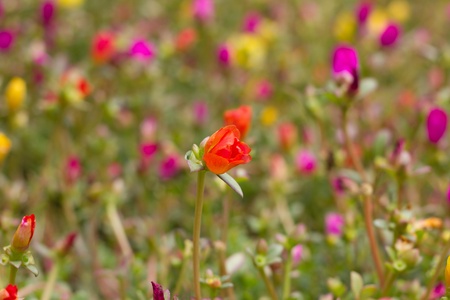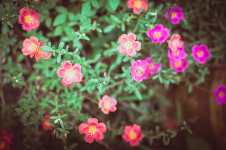 Portulaca, Japanese rose, Moss roses, little hogweed orange flowers, with blur the backdrop in garden. Abstract blurred background concept.