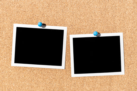 Two Blank Vintage instant photo frame pinned on corkboard. Template