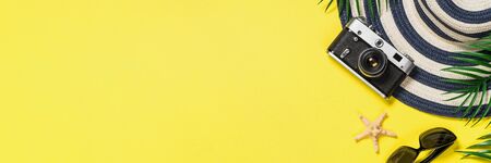 Summer travel flat lay background. Old film camera, hat, sunglasses, shell and palm leaves on yellow background. Long banner format.