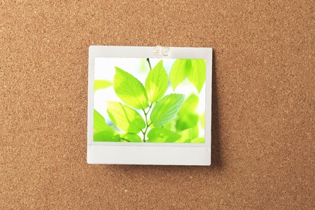 Cork notice or bulletin board with blank instant camera photo print and several sheets of untidy torn notepaper. Space for copy.