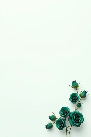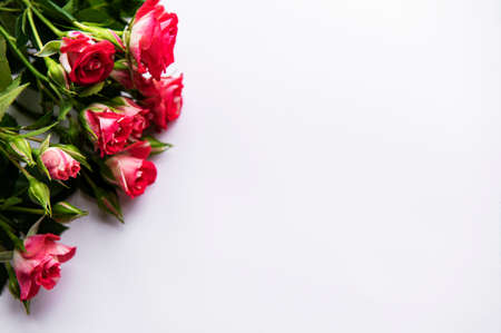 Rose composition on the colored background. Overhead top view, flat lay. Copy space. Birthday, Mother's, Valentines, Women's, Wedding Day concept.