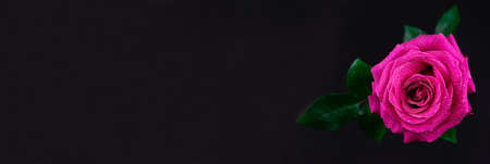 pink rose flower on dark background. A pink rose flower with green leaves on a dark background with selective focus. Pink flowers, the concept of a poster on the wall. horizontal image