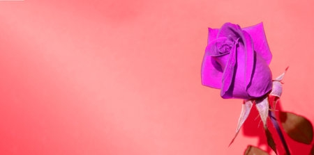 closeup red rose flower corner on violet and red background, nature, name card, template, copy space