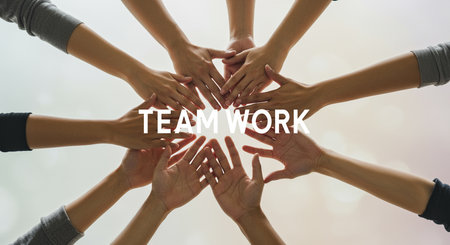 Teamwork concept with diverse hands coming together against sky, symbolizing unity, cooperation and collaboration.