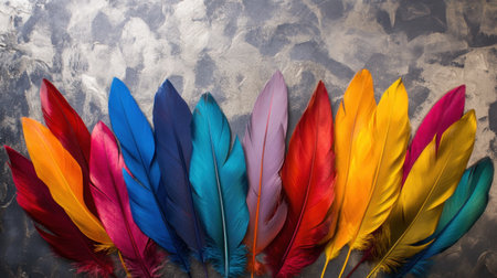 This stunning image features a vibrant arrangement of colorful feathers spread out against an abstract background. Perfect for art and design projects, this photo captures the beauty and diversity of natural plumage.