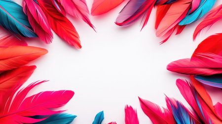 A vibrant arrangement of colorful feathers encircles a white space, perfect for adding text or other design elements.