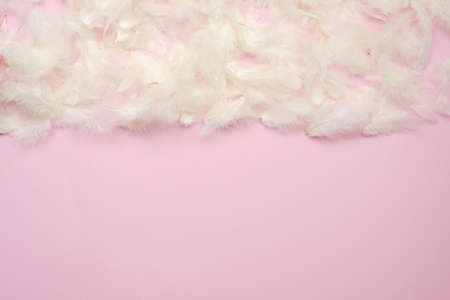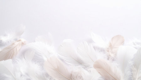 A collection of delicate white feathers scattered gracefully on a soft background. The simplicity and elegance create a calm atmosphere, perfect for various design projects.